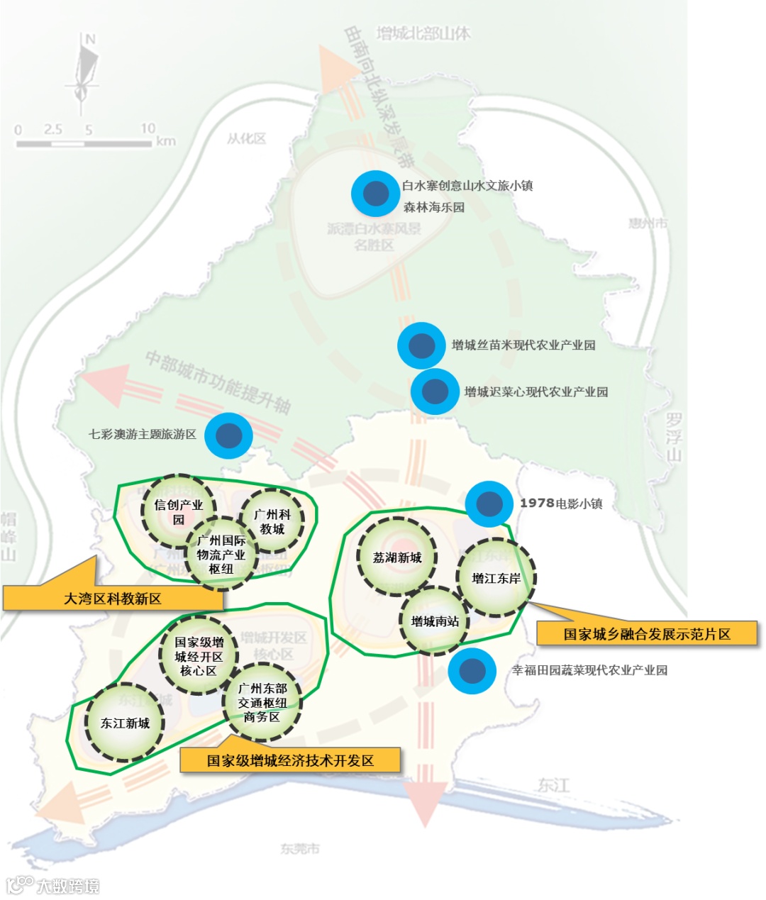 围绕增江东岸、荔湖新城、增城南站,布局汽车及新能源汽车、新材料、生命健康、专业服务等产业。
