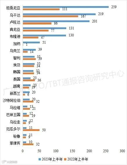 在与我国签订共建“一带一路”合作文件的149个国家/地区中*²,本年上半年共有50个国家/地区提交了1429件TBT通报,同比增长37%,占WTO成员总通报数的69.8%。上述提到的坦桑尼亚、乌干达、卢旺达和加纳国家TBT通报数明显增加,而厄瓜多尔和菲律宾等国家的TBT通报则明显下降(见图1)。
