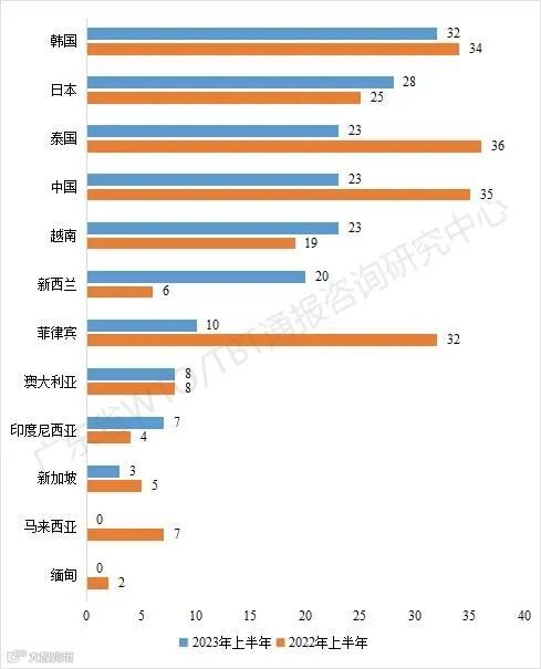 《区域全面经济伙伴关系协定》(RCEP)*³成员国2023年上半年共提交了177件TBT通报,同比下降16.9%。其中,TBT通报数减少较为明显的有泰国、中国和菲律宾等,分别下降36.1%、34.3%和68.8%。马来西亚、缅甸、文莱、柬埔寨和老挝本年上半年尚未提交TBT通报(见图2)。