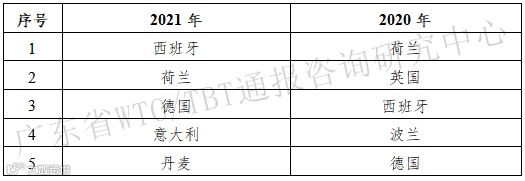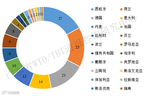 2021年通报中国产农食产品最多的国家是西班牙,共通报27例,占中国产农食产品被通报总数的16.9%。其次为荷兰和德国(见表7、图8)。