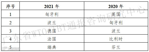 2021年提交TBT通报数量前十国家/地区中,以发展中国家为主。乌干达(排名第1)和巴西(排名第2)提交的TBT通报数与去年相比分别增加65.7%和39.3%;而肯尼亚(排名第4)提交的TBT通报数比上年则下降了37.5%;美国(排名第3)和欧盟(排名第10)仍是提交TBT通报数最多的发达国家/地区,数量比上年小幅增加。