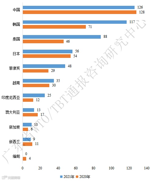 《区域全面经济伙伴关系协定》(RCEP)*成员国2021年共提交了530件TBT通报,比上年增加28.6%。中国是RCEP成员中提交TBT通报最多的国家,共126件。另外,韩国提交的TBT通报数也较多(117件),占RCEP成员国提交总量的22.1%;泰国、日本提交的TBT通报数分别为88件和56件;新加坡、新西兰、马来西亚等成员提交的通报较少;文莱、柬埔寨、老挝、缅甸本年度并未提交TBT通报(见图2)。