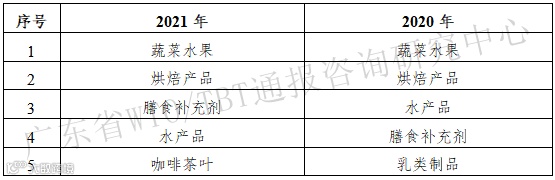 2021年,美国食品药品管理局(FDA)共计通报拒绝进口13397批次,比上年减少22.2%,对中国输美产品(含农食产品、医疗产品、化妆品及烟草产品等)通报拒绝进口2486批次,比上年减少49.2%,占FDA通报数的18.6%,较上年下降9.8个百分点。在农食产品方面,FDA通报拒绝进口农食产品5733批次,比上年增加11.7%。中国输美农食产品被拒绝进口通报581批次,比上年减少18.6%,占FDA通报农食产品总数的10.1%,较上年下降3.8个百分点。其中,被拒绝进口的农食产品以蔬菜水果和烘焙产品居多(见表5、图6)。