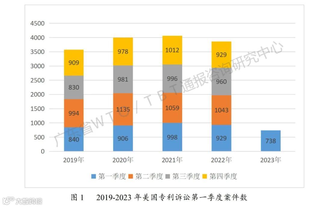 2023年一季度,美国联邦地区法院共受理专利诉讼案件738起¹,同比和环比均下降20.56%,案件量跌至近五年最低水平(图1)。