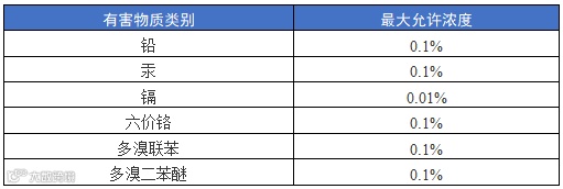 电子电气设备及装置中有害物质在均质材料中的最大允许浓度值(按重量计算)如下: