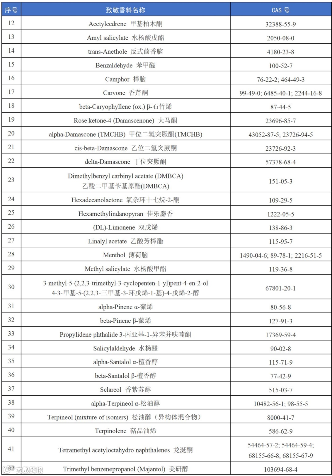 根据玩具安全指令2009/48/EC附件II第III部分的现行要求,第11点的第3段中表格所列致敏香料,若在玩具或其部件中添加的浓度超过100 mg/kg,则应在玩具、加贴标签、包装或随附单页上列出该致敏香料的名称。