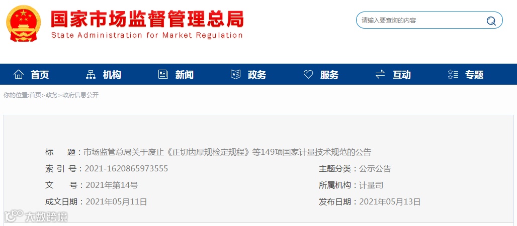 5月13日,市场监管总局发布公告,决定废止《正切齿厚规检定规程》等149项国家计量技术规范。