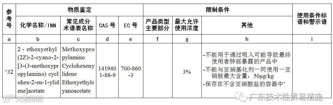 依据SCCS的意见,欧盟委员会授权S87作为UV防晒剂在化妆中使用,最高允许浓度3%,不可用于通过吸入可能导致最终使用者肺部暴露的产品。就此,欧盟化妆品法规附录VI化妆品准用UV防晒剂清单新增如下条款,自2020年12月3日起生效实施。
