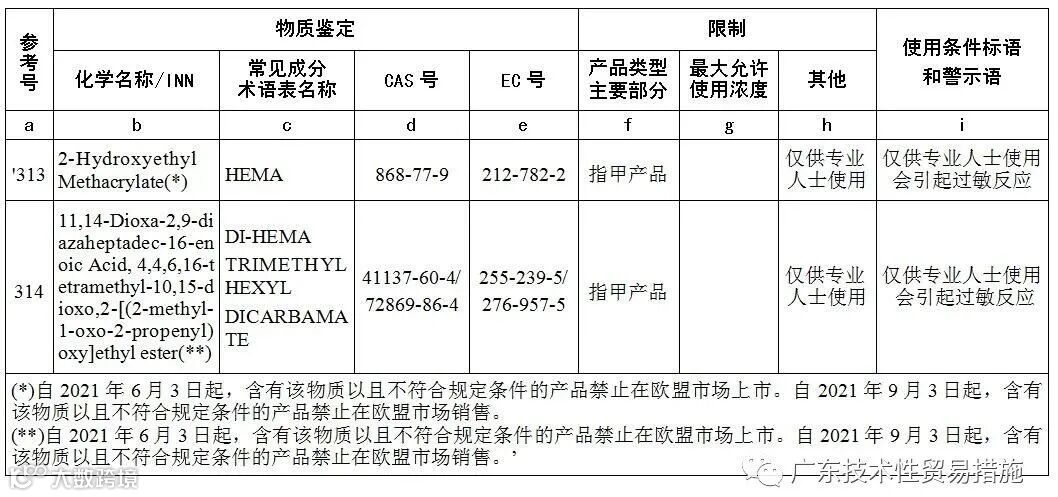 基于上述考虑,欧盟委员会授权HEMA和Di-HEMA TMHDC用于美甲产品,但仅限专业人士使用并需添加特定警示。就此,欧盟化妆品法规附录III新增第313和314条款,具体如下: