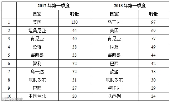 表1 2017年和2018年第一季度通报数量前10位的成员列表