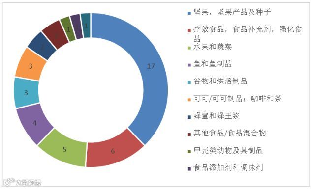在被通报的农食产品中,被通报最多的依然是坚果/种子产品,占被通报的中国产食品总数的37.8%,其次为食品补充剂、水果蔬菜(详见表8、图7)。