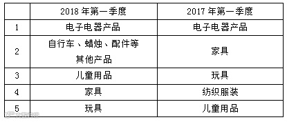 表2 2018年第一季度与去年同期美国CPSC召回产品列表前5位比对