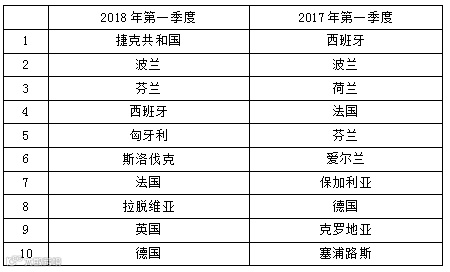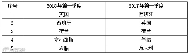 表9 2018年第一季度与去年同期欧盟RASFF召回食品前5位通报国家对比