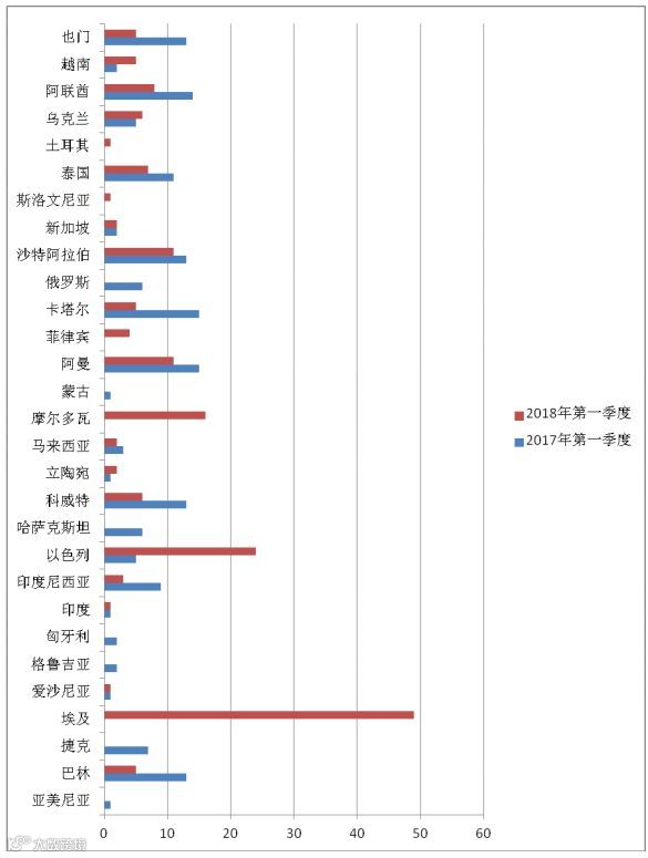 图1 2017年和2018年第一季度一带一路国家通报数比对