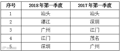 表6 2018年第一季度与去年同期美国FDA拒绝广东农食产品进口前5个地级市比对