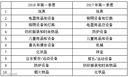 表3 2018年第一季度与去年同期欧盟RAPEX召回产品前10位对比