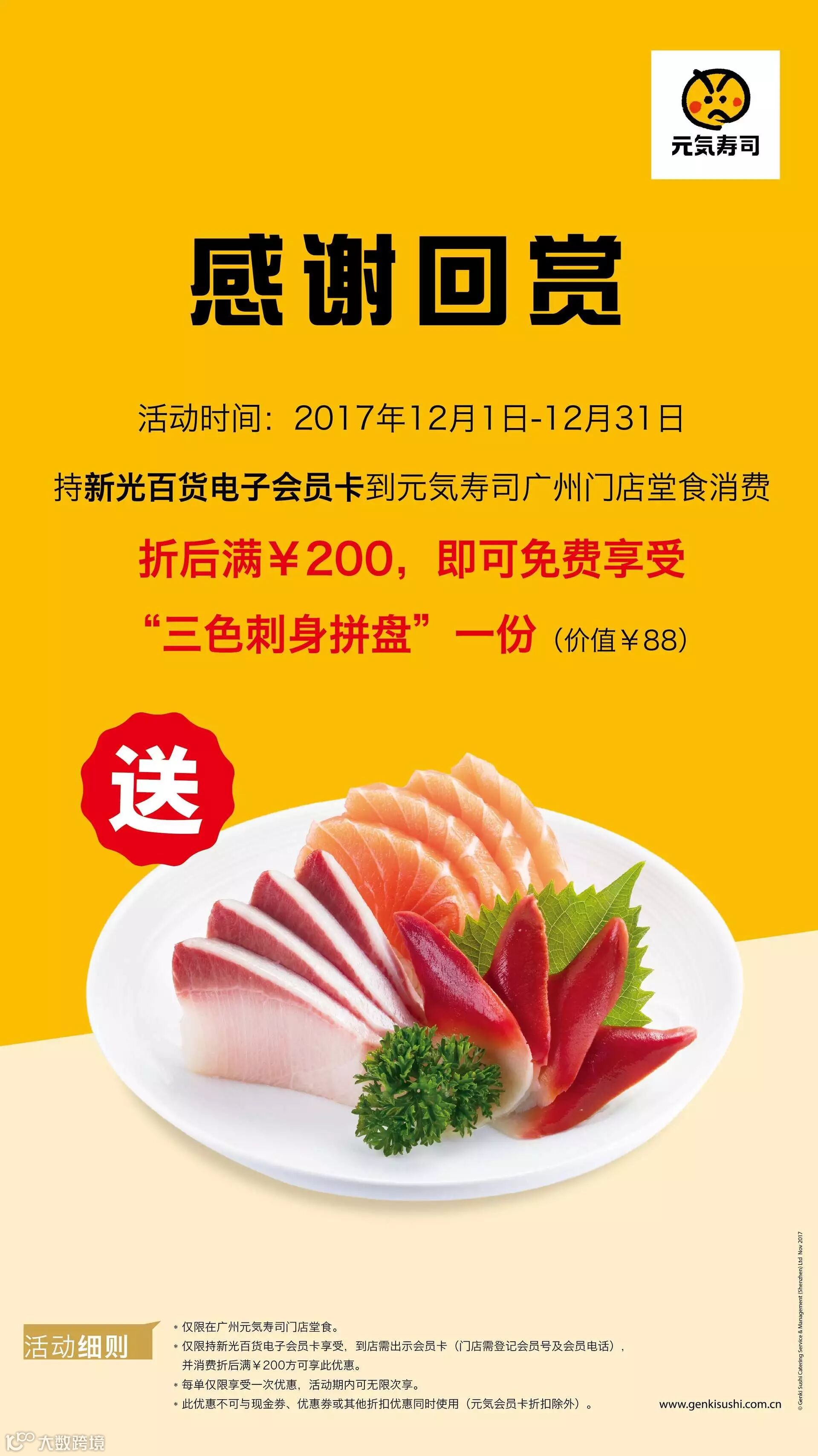 【12月会员特享】元气寿司88元三色刺身霸气赠送!不吃都对不起自己!