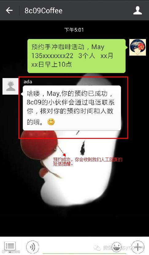 通过8c09Coffee公众号留言预约,请留下你的手机号,姓名,人数,预约日期时间,预约成功,工作人员会通过电话联系你的,核对预约的人数和时间的哦!