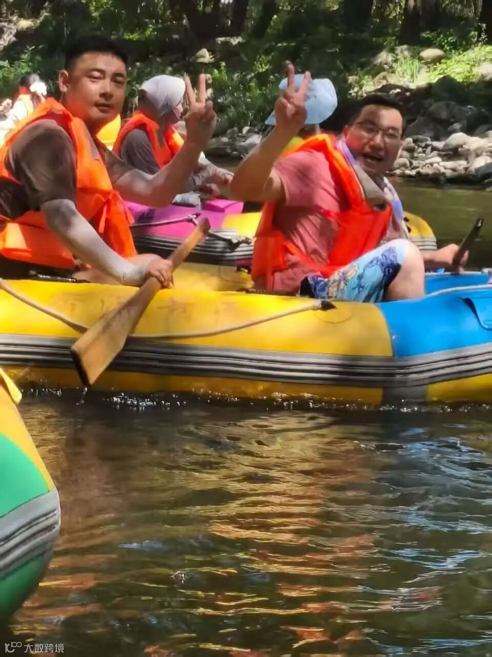 8月17日7:00,团队前往翡翠谷与香溪漂流。在翡翠谷,众人沿溪漫步,欣赏因岩石折射与藻类映衬呈蓝、绿、青等色的“五彩池”,纷纷拍照与亲友分享惊喜。随后的香溪漂流,大家两人一组乘橡皮艇顺流而下,既有平缓水域的惬意,也有急流冲滩的刺激;遇浅滩时伙伴互帮推船,溅水互动间欢笑不断,进一步增进了默契与情谊。