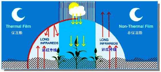 右部是普通膜,夜间红外线仍然能穿透密闭的温室散失到大气中。左侧为保温膜,通过加入红外线阻隔剂,夜间温室内的红外线被温室内层的添加剂反射回来。继续被温室内的土壤作物骨架等吸收,再释放,如此循环。我们不能说热量完全不被散失——记住一切的功能都是控制与辅助——但会非常缓慢。