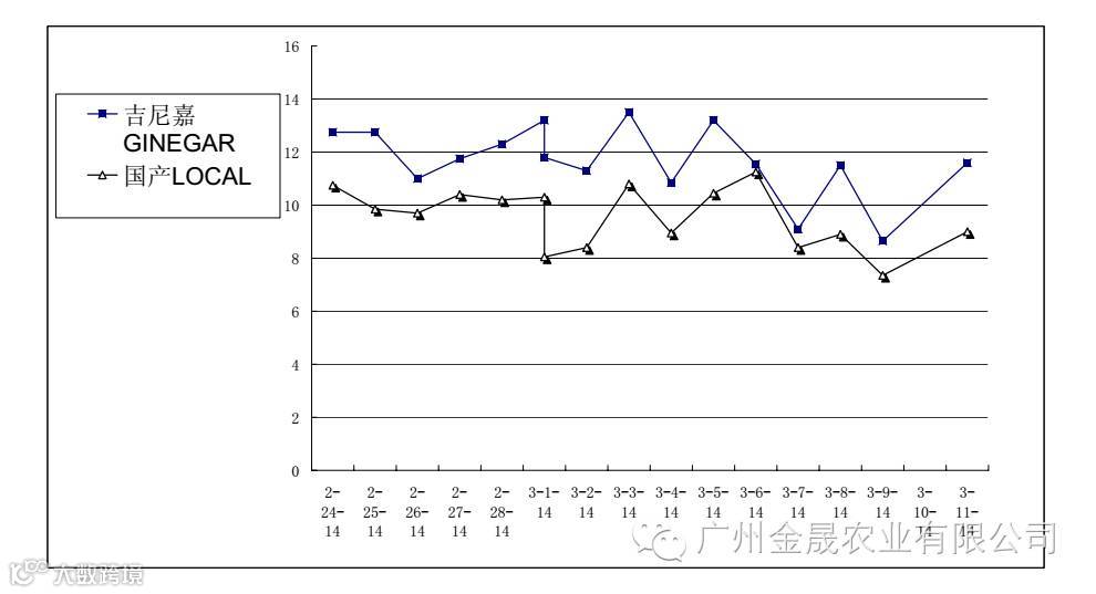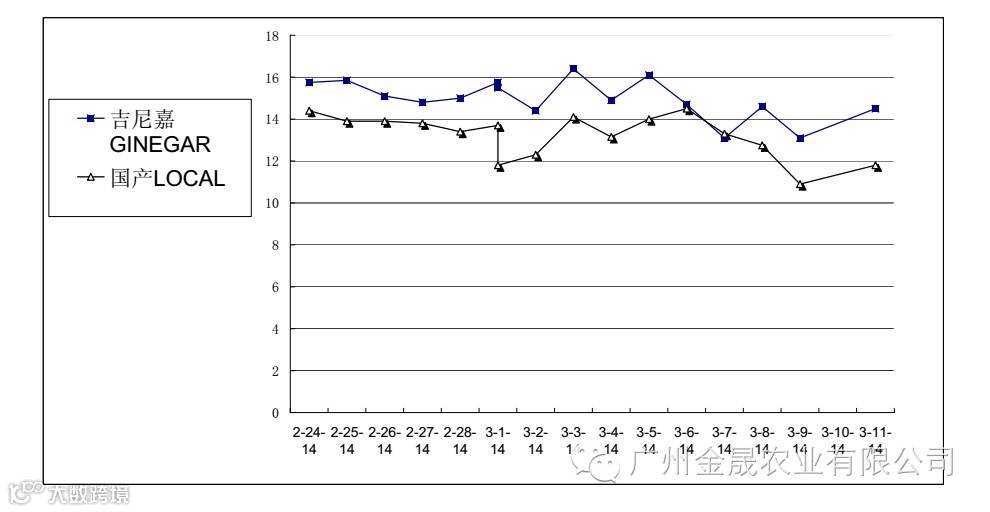 图2 为温度仪安置在平拉膜以下的情况下,吉尼嘉膜与国产普通膜的最低温度值的比较与差异。