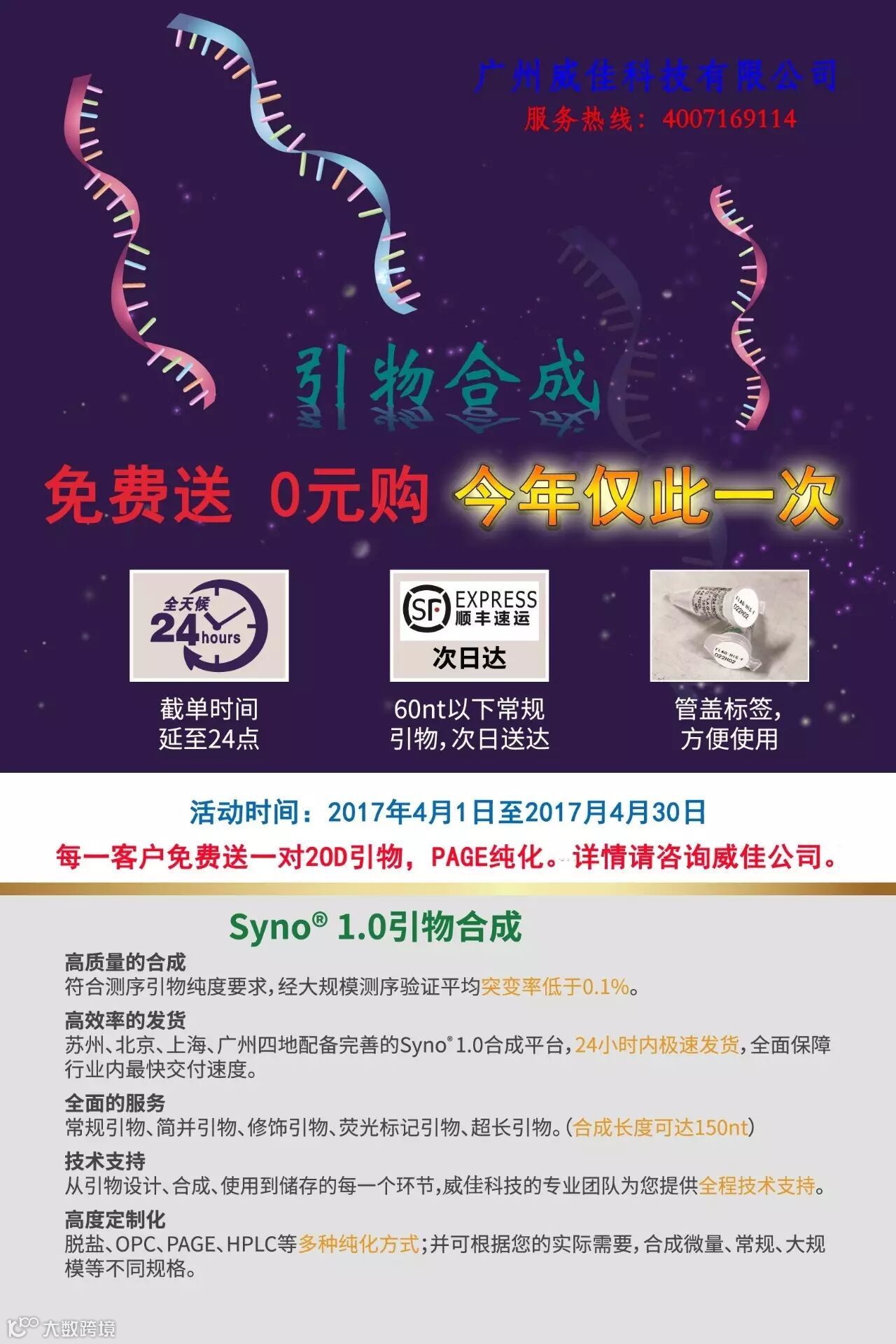 导读:每一客户免费一对2OD引物,PAGE纯化。详情请咨询威佳公司。
