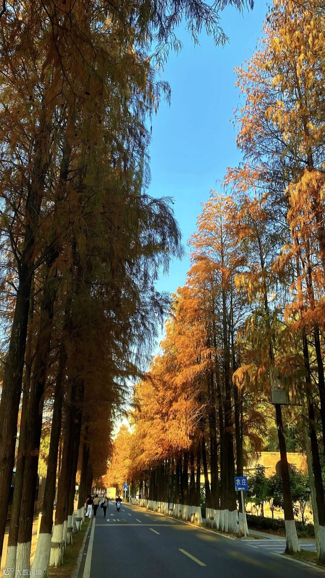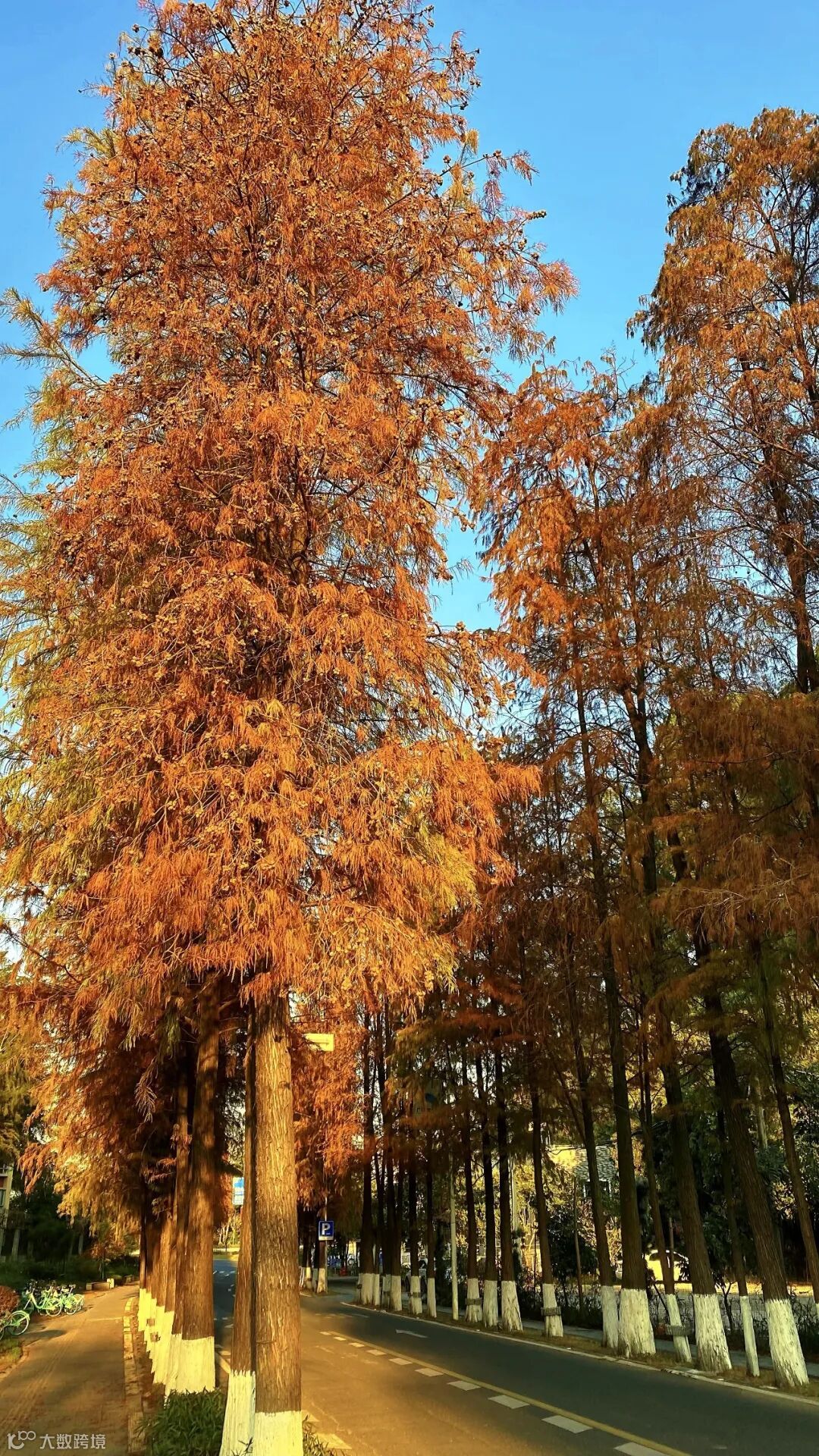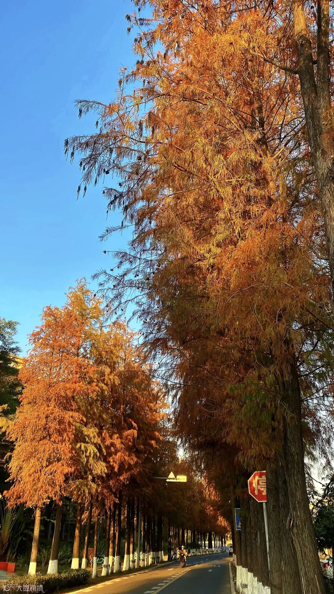 道路两侧的落羽杉高耸入云,