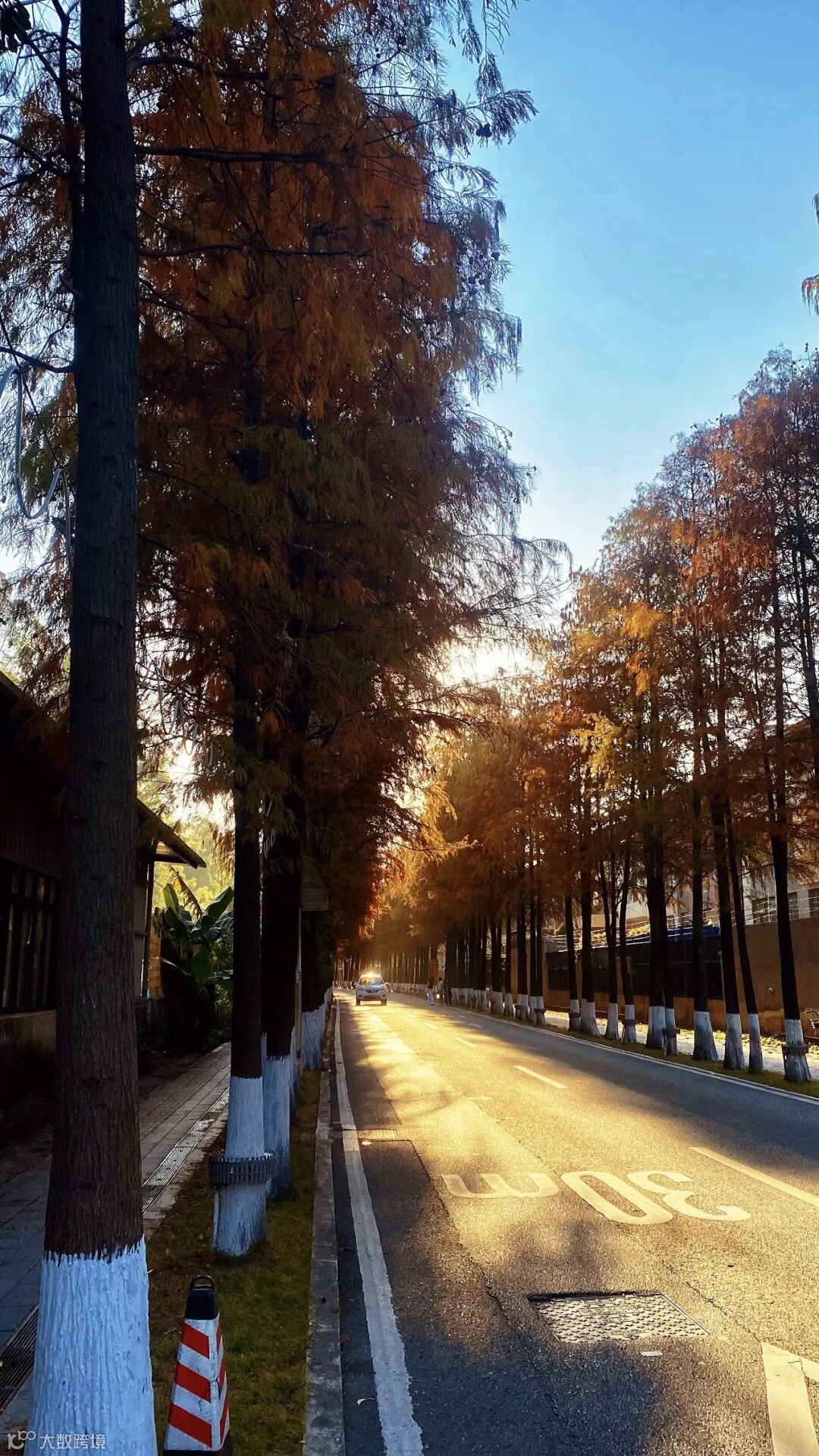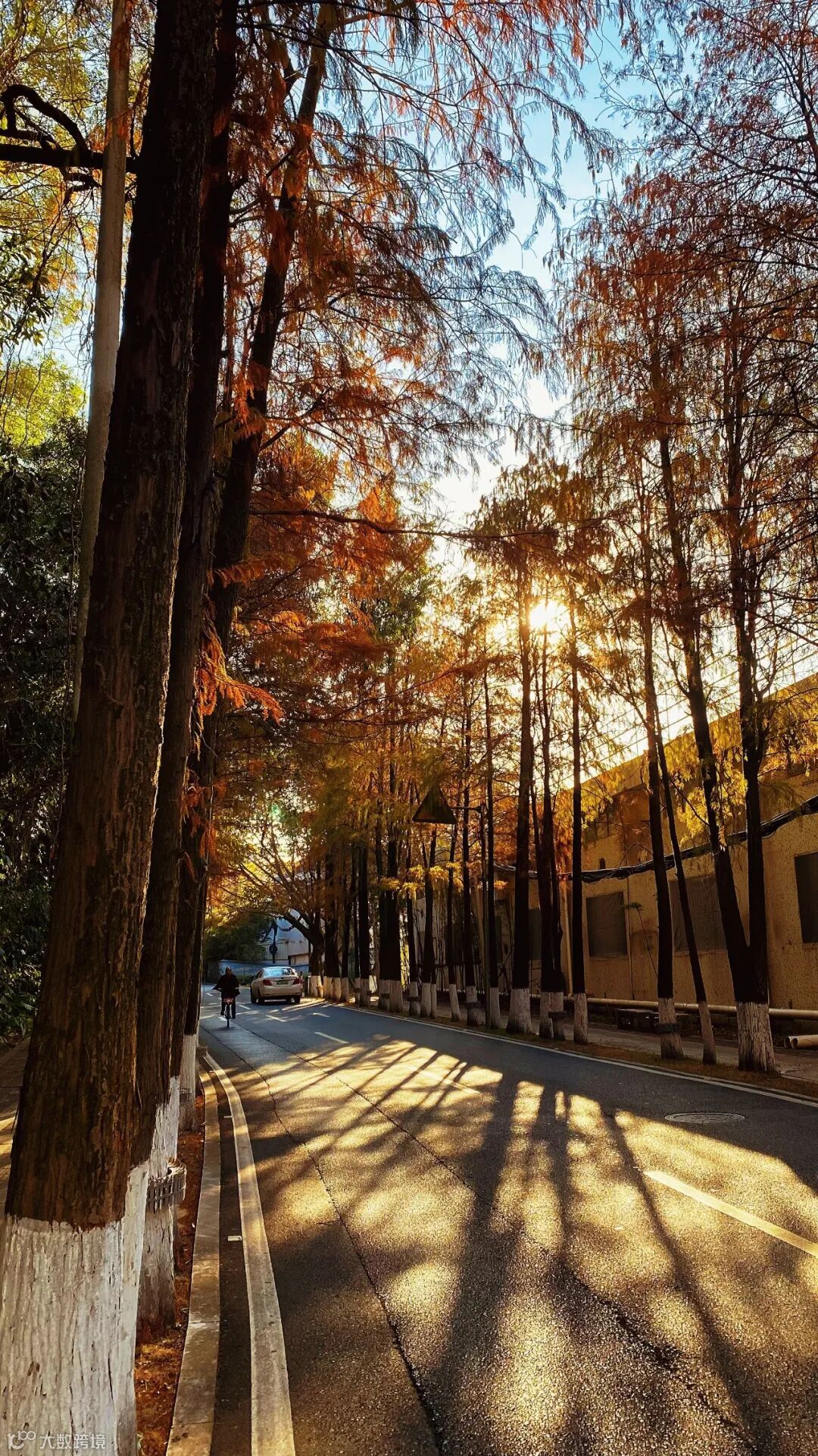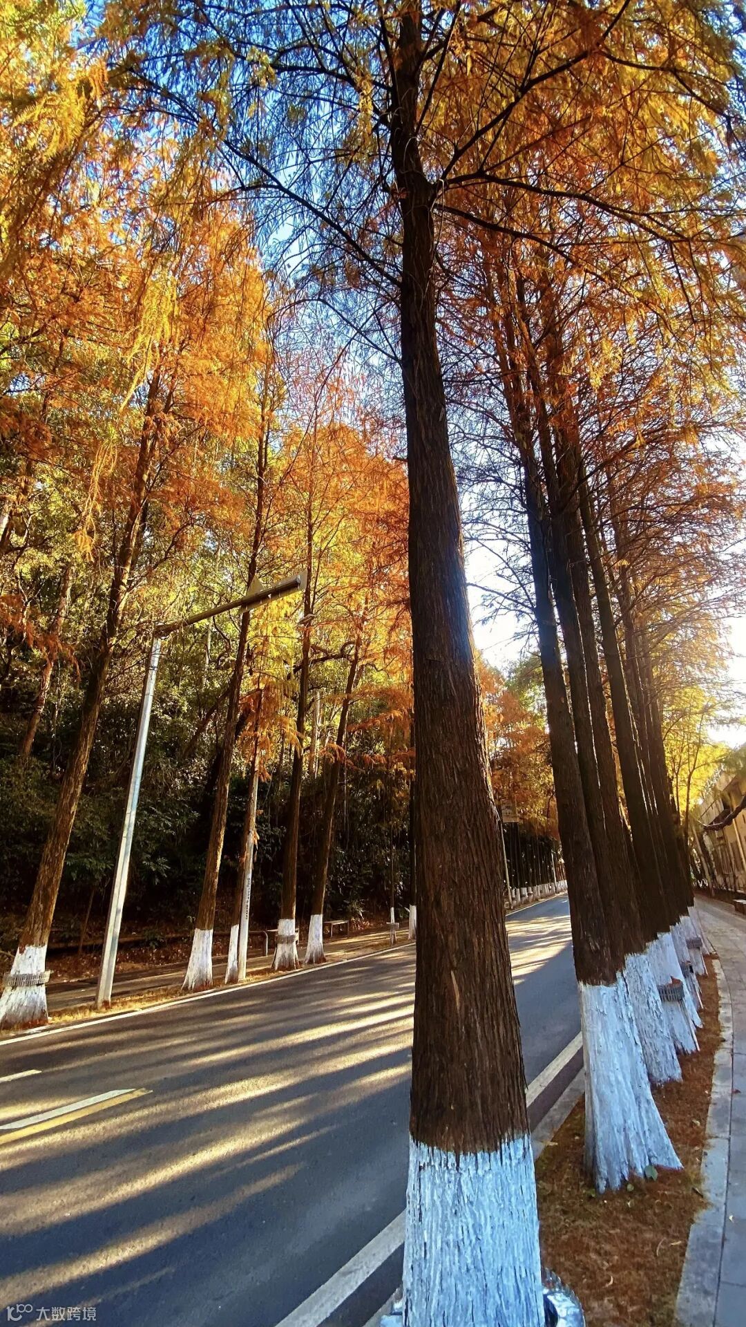 道路两侧的落羽杉高耸入云,
