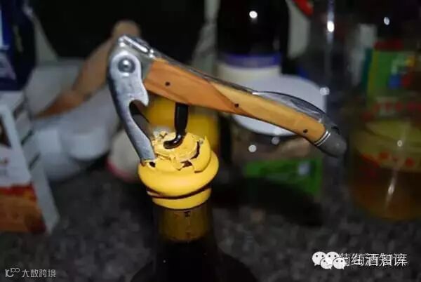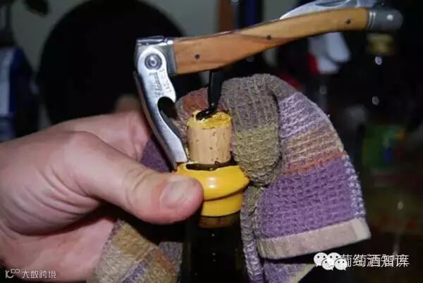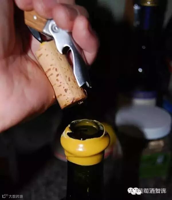 其实不要需要用刀削掉蜡封,用开瓶器钻入蜡封的顶部中心。接下来慢慢地地拔瓶塞。但不要全部拔出来!当出现散落的碎屑时,可以使用湿毛巾轻轻擦去。使用酒刀继续拔出。