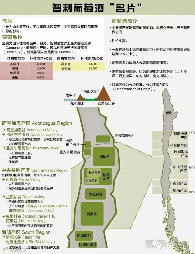 下面用一个最简洁也最清晰的图片,向您一一展示智利的葡萄酒产区以及与之相关的信息要点,让您一图在手,不愁学不会智利葡萄酒!