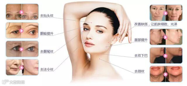 脸部、颈部与提眉,收紧皮肤松弛,如眼袋、法令纹、嘴角纹、双下巴,提升额头的皮,眼皮下垂、眼眉,抚平额头、眼睛、嘴唇四周的皱纹、改善颈部老化,恢复皮肤弹性,紧致轮廓,以渐进式的方式全方位改善皱纹、紧致与脸颊拉提。