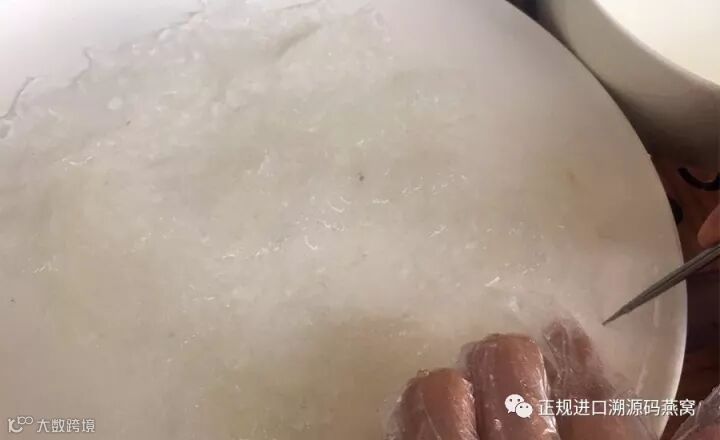 等燕窝泡到半透明,没有白芯的时候,将燕窝按照它的纹理撕成一条条的。撕成条的理由是便于后面的挑毛和炖煮。