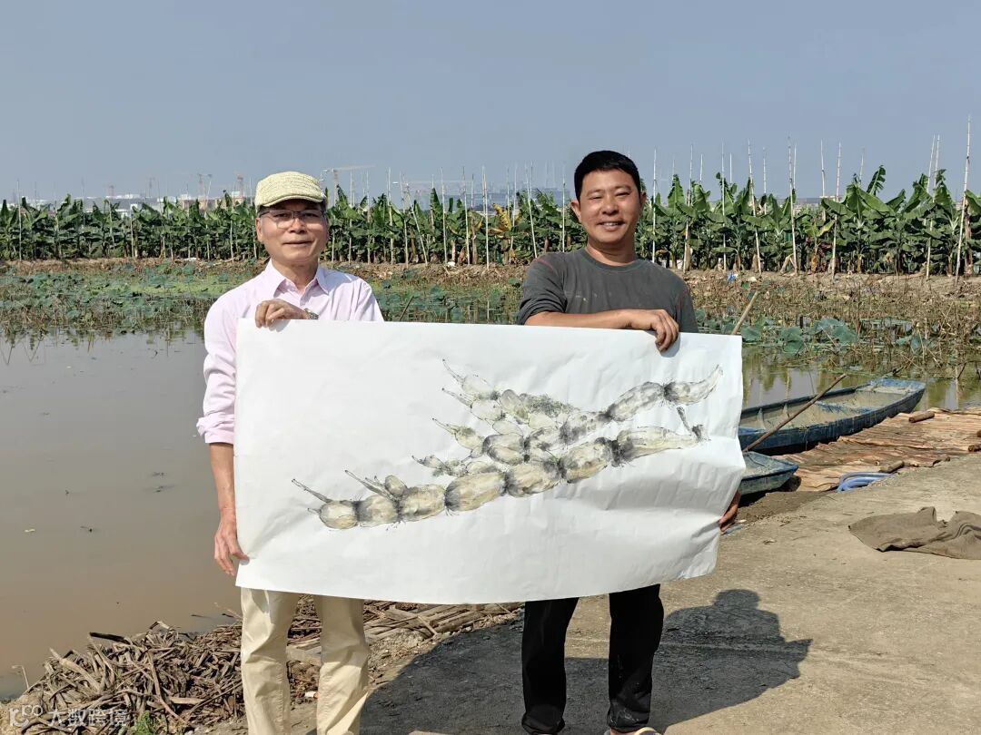 此时我们的写生画也画好了,邝老师用水墨把一组莲藕画得硕大壮实,栩栩如生,塘主阿恩看后非常喜欢,问能否把画拍摄下来,用来印制莲藕包装箱用,邝老师欣然同意。我们便把画作铺平拍摄,用微信发原图送给塘主。我们想,正好以绘画,向莲藕塘的劳动者表示敬意!