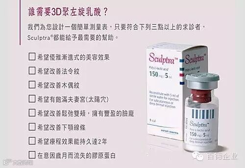 聚左旋乳酸,又称童颜针(Sculptra),被医学美容界称为“3D液态美容”,2013年“3D液态童颜针”进驻内地,它是具有填充、紧致、拉提、回春多重效果的微整形新武器。将“营养细胞再生技术”与“扇面网状定位技术”综合应用,将童颜材料以“网状支架”结构的方式注射在脸部软组织容易流失的区块,注入后脸部下垂部份就会像搭帐蓬似的(Tenting),自然的被拉紧上提!全脸网状注射补充肌肤所需的营养细胞,更容易在短时间内激活成纤维细胞生长与再生,促进胶原分泌,使真皮层组织变厚,填补流失的组织,从而可以达到改善粗大皱纹、紧致提升活化肌肤的效果。