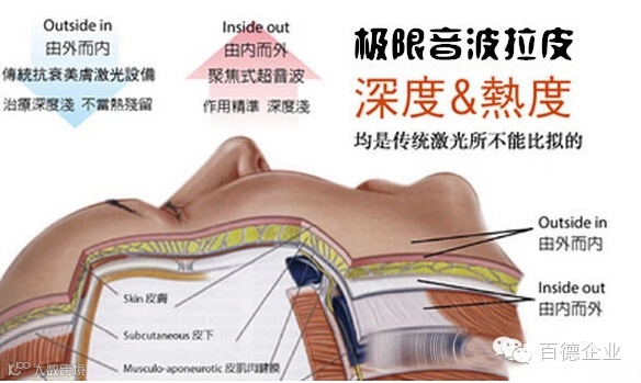 Ultherapy 聚焦超声波 唯一通过FDA一次性“拉提”认证,美国Ultherapy原裝“超声刀”,它与Thermage CPT不同治疗概念新技术,两者相辅相成,而非外界炒作之替代品。Ulthera ● 也俗称【极线(超)音波拉皮Ultherapy】● 国内日前已推出了全新的不动刀拉皮技术—「聚焦式超音波紧肤术」,不需开刀就可拥有拉皮效果的革命性新技术。● 取得 FDA “Lifting”(拉提) 适应症的无伤口、无恢复期、无须多次治疗的划时代紧緻仪器! ● 经临床实验证实,Ulthera不需重覆治疗,就可以达到紧緻及改善皮肤的效果!Ulthera 拉提 原理(聚焦式超音波直抵SMAS层,强效拉提)Ulthera 的作用原理,是以高强度聚焦式超音波 (High Intensity Focused Ultrasound; HIFU),将超声波聚焦于单一个点,以产生高能量,作用肌肤真皮层、SMAS层,刺激胶原蛋白的增生与重组,有效达到紧致轮廓及抚平纹路的效果。由于紧緻治疗的关键主要有二点:深度、温度,Ulthera 治疗深度为3.0mm~4.5 mm,除了作用到纤维中隔之外,还可以作用到更深部的SMAS层,SMAS层正是手术拉皮时会治疗到的重要拉提关键,因此Ulthera 大大突破了以往的限制,是首创能以非侵入式方式治疗SMAS的仪器。加上Ulthera 的每单一能量点(TCP)在皮下作用的温度可到达65℃~70℃,是目前所有非侵入式紧肤仪器的较强温度,能确实有效的刺激胶原蛋白增生,同时因能量是掠过表皮,所以完全不需担心表皮受伤!Ulthera 拉提 与 电波、雷射治疗能量比较● RF无线电波的代表性仪器为电波拉皮Thermage CPT,能量来源为电波● 雷射的代表仪器为长脉冲波长1064奈米的光波拉皮雷射,能量来源为光波。●Ulthera,能量来源为超音波,从上表可看出 Ulthera加热温度高、治疗深度深、同时又精准。Ulthera 拉提 探头Ulthera 的探头名称是“Transducer”超音波能量传导器,目前有三种深度(4.5mm/3.0mm/1.5mm) 的Transducer。主要差异会在于治疗深度与治疗能量点的长度,全脸治疗通常建议使用两种以上深度的transducer达到深浅两层作用疗效,发数分配可依照医师的判断及病患需求选用。目前,Ulthera 主要治疗脸部及颈部,但Ulthera 已与世界各地的医师研究中(30个研究桉进行中),积极开展其它治疗应用部位,如腹部、手臂、前胸、膝盖...等部位都是短期内可预期的。Ulthera 拉提 『即时可见(real time)』科技专利DeepSEE科技,使治疗中可立即观测皮肤周围组织层专利独创“定位指标线”精准落点能量位置,安全无虞,清晰明确Ulthera 拉提 突破性技术每一热凝结点都像一粒小米的大小,65˚C 最佳胶原蛋白变性温度 可确实刺激胶原蛋白新生机制。治疗完后产生约8,000~10,000个分布于两种深度的独立的凝结点,且立即产生组织收缩并启动胶原蛋白新生过程。Ulthera 拉提 治疗效果Ulthera 优势在于,只需要进行一次疗程便可以启动皮肤再生程序,刺激胶原蛋白大量增生,为肌肤带来持续而明显的改善,且效果可维持两年年半至五年。Ulthera 拉提 优势特点• 深度最深 直接对深层筋膜(SMAS)层作用• 温度最热 非侵入性刺激深层胶原蛋白和弹性纤维增生• 精准无比 聚焦式超音波定位,精准治疗不伤周边组织• 立即可见 拉提紧緻效果即刻拥有• 无恢复期 亮丽现身,完全不影响生活作息• 拉提认证 取得FDA“Lifting”(拉提)适应症• 免动手术 无伤口,告别微整、动刀• 效果持久 拥有长时间紧緻轮廓拉提• 过程舒适 能量仅掠过表皮,表皮无疼痛Ulthera 拉提 好莱坞女星的新宠Ulthera 拉提 超级粉丝