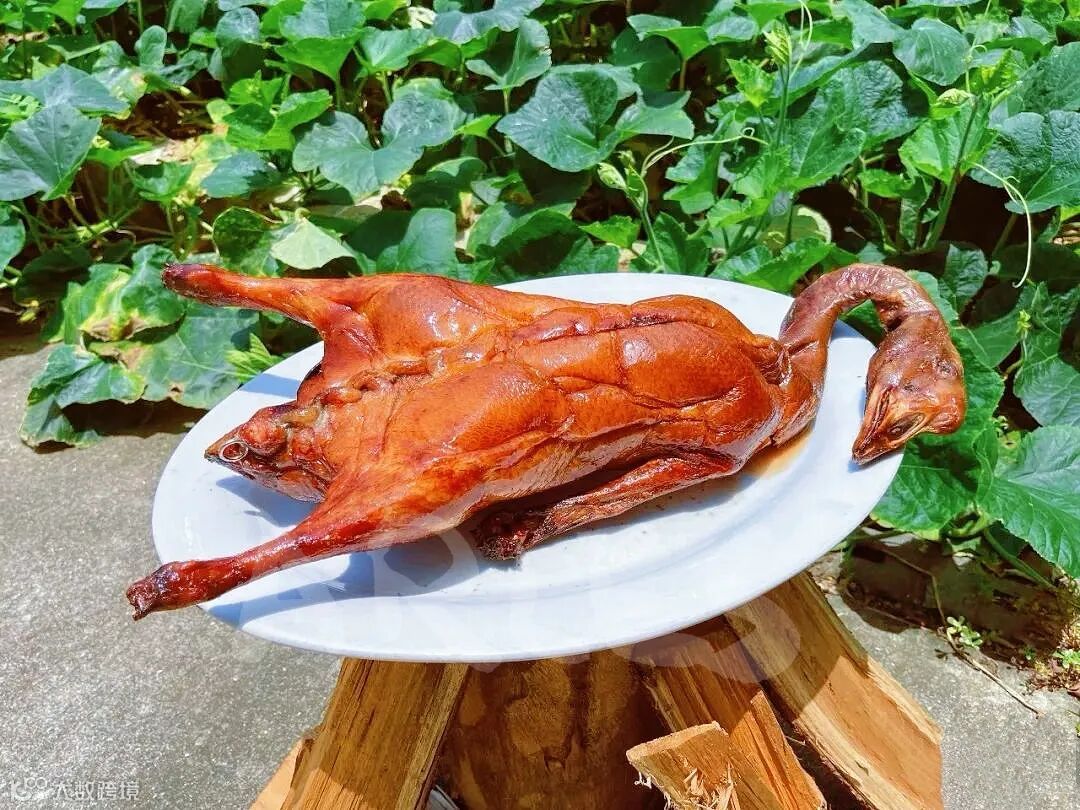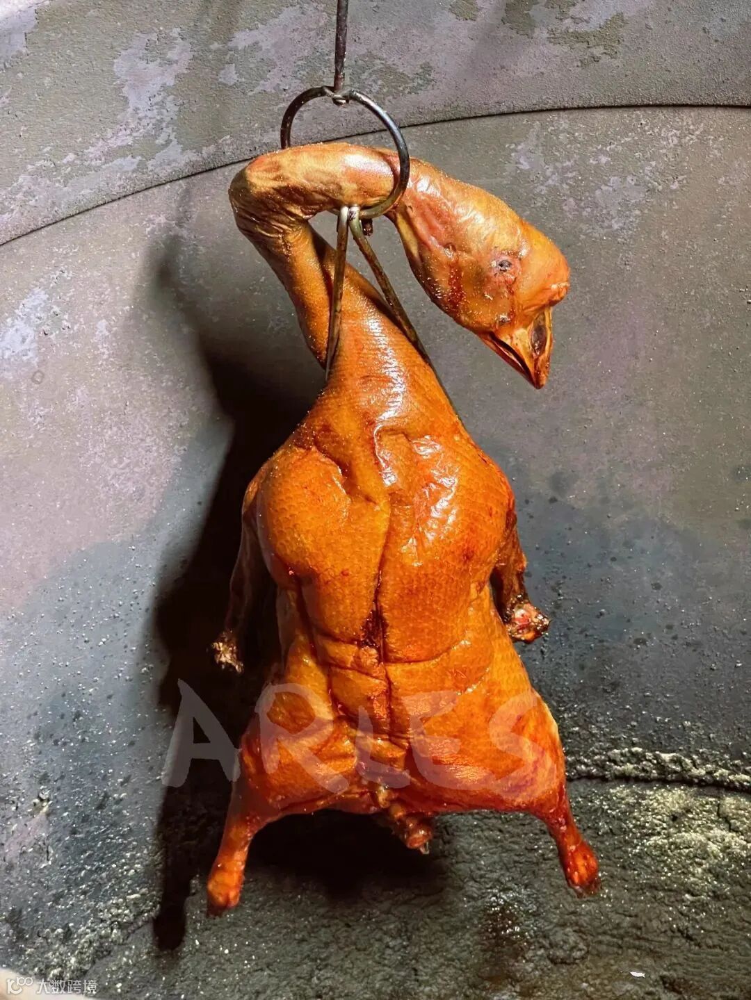 烫皮+风干(关键!7-8小时):滚水烫皮锁紧,再均匀刷上白醋+麦芽糖秘制“脆皮水”,然后开启漫长嘅风干马拉松!呢个步骤至关重要,直接决定皮嘅脆度同色泽。等足七八个钟,鹅皮紧致如鼓面,酱香早已深入骨髓。