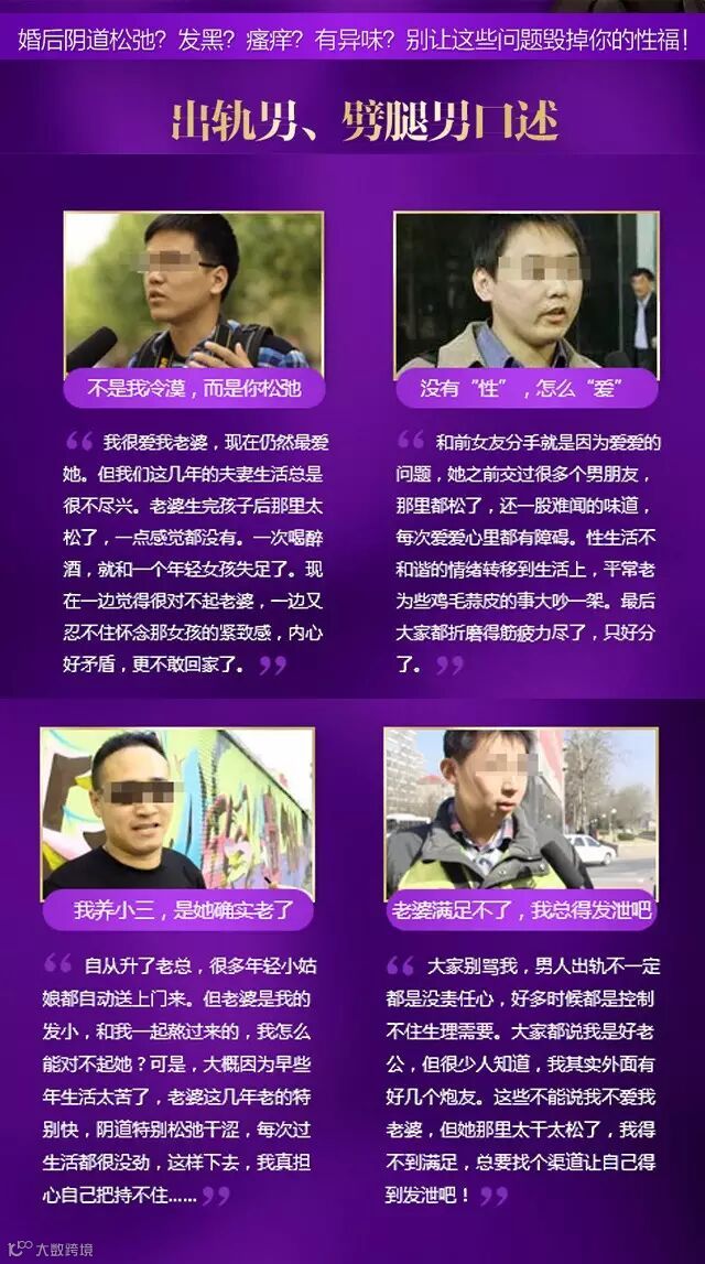 性生活过多或者产后致使阴道内壁性细胞干瘪,导致阴道无弹性,同时萎缩死亡的细胞堆积成一个“阻隔层”,让女人敏感度下降。年轻时的“紧握感”,“娇滴水润”荡然无存。男人应付了事,更喜欢年轻活力的二奶,小三,苦心经营的婚姻遭遇危机。