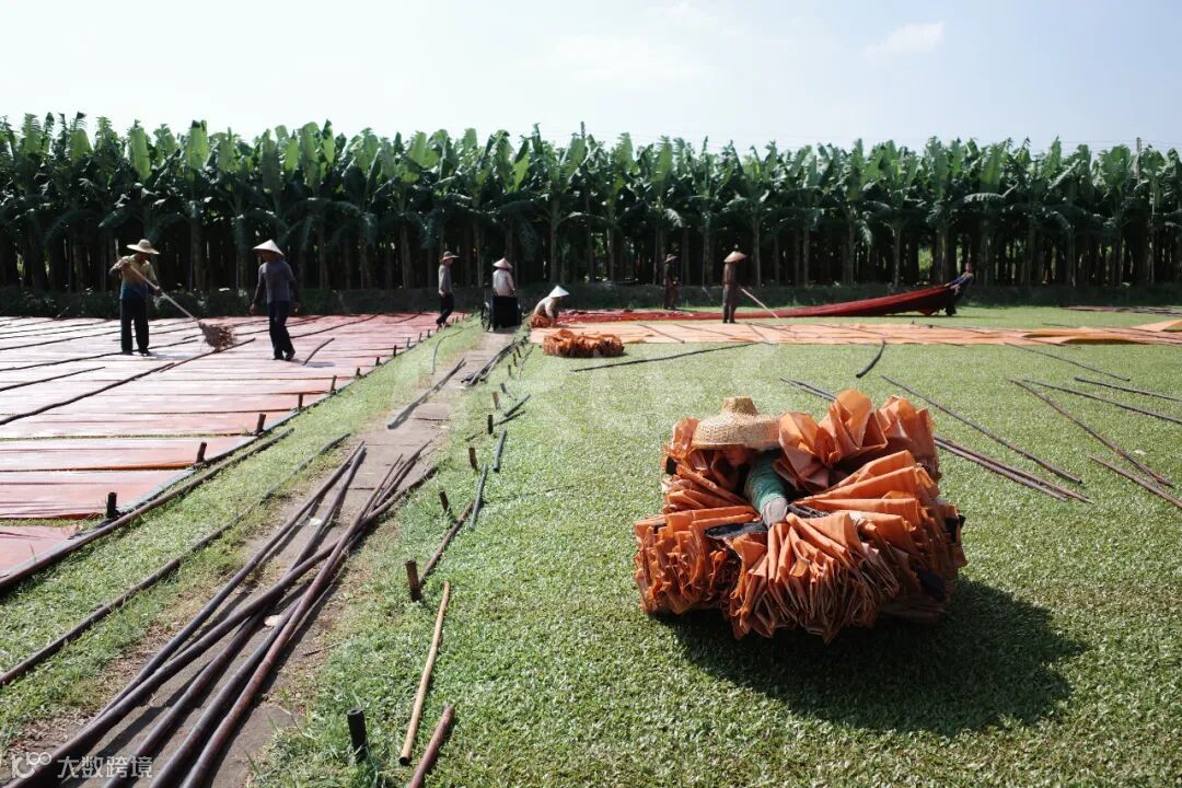 折叠要点与成品形态:折叠过程中,工人必须动作轻柔,一边整理褶皱,一边防止形成死褶,最关键的是避免在折痕处折断已变脆硬的丝绸纤维。凭借熟练而麻利的技巧,工人很快便将整匹坯绸折出均匀的褶子。接着,将打好褶的坯绸拦腰对折,整匹绸便形似一把橘红色的大扇子。最后,工人将其抱入染坊存放,静待下一道工序——封莨水。