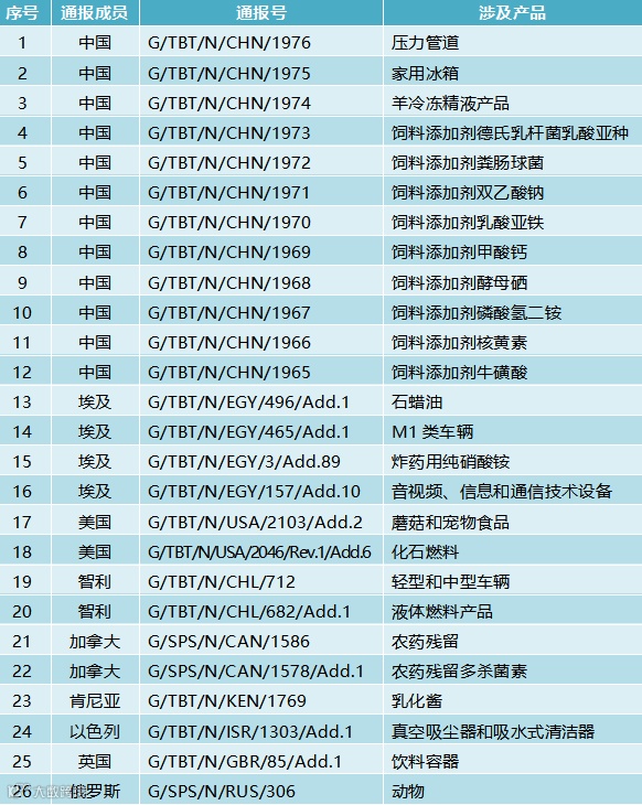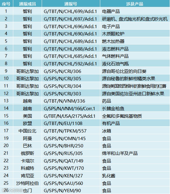 2025年2月10日,共有15个WTO成员通报了26项技术性贸易措施,其中12项为TBT措施,14项为SPS措施。通报情况为:智利8项、哥斯达黎加4项、越南2项、美国1项、欧盟1项、中国台北1项、阿联酋1项、阿曼1项、巴林1项、俄罗斯1项、卡塔尔1项、科威特1项、肯尼亚1项、沙特阿拉伯1项、也门1项。这些措施涉及电器产品,电子产品,木质颗粒炉,气体燃料产品,药品,全氟和多氟烷基物质,有机产品,冰箱,食品等。通报详情如表1所示。
