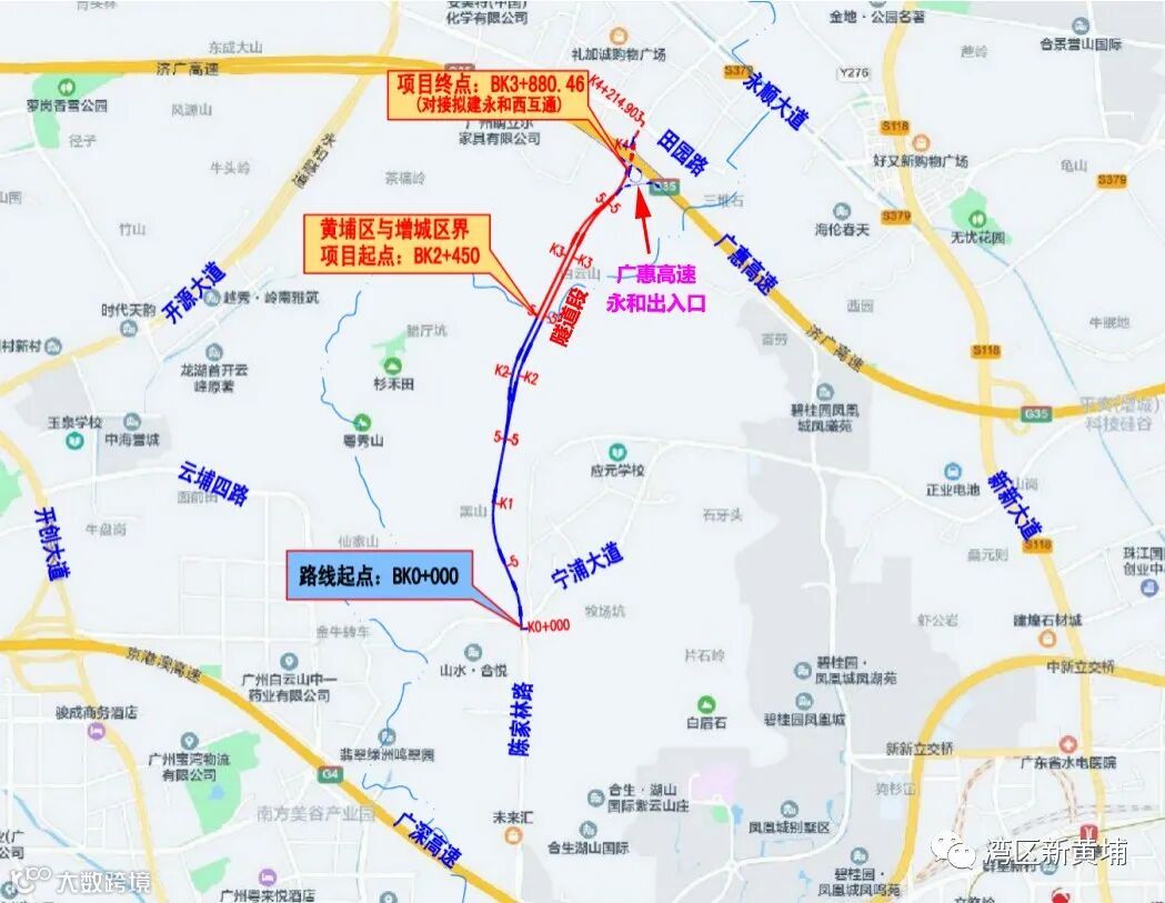 南起于增城区陈家林路与宁埔大道平交口,终于增城与黄埔区界处,向北延伸接入黄埔区新元路,路线长约2.379km,其中隧道段长422m,桥梁段长175m,路基段长1787m,桥隧比为 24.88%,断面宽 31.5、40m。