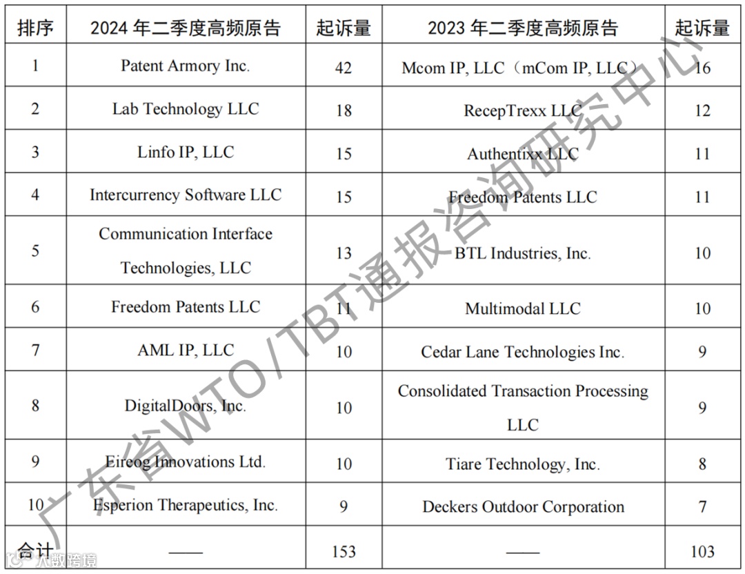 如下表所示,二季度高频原告呈现以下特点,一是高频原告提起的专利诉讼案件量同比上升但环比下降。二季度排名TOP10的高频原告提起的专利诉讼案件量达153起,同比增长48.54%,但环比减少12.07%。二是高频原告集中度相对稳定。排名TOP10的原告提起的专利诉讼案件量占二季度案件总量的15.69%,比2023年二季度提高2.89个百分点,但较2024年一季度下降5.48个百分点,可见案件量虽集中在高频原告群体但集中度总体稳定在10%-20%区间。三是高频原告新老面孔参半,且九成为NPE³。Lab Technology LLC(18起)、Intercurrency Software LLC(15起)、Eireog Innovations Ltd.(10起)、Esperion Therapeutics, Inc.(9起)均为2021年以来首次上榜原告,共提起52起诉讼,其中Lab Technology LLC、Intercurrency Software LLC、Eireog Innovations Ltd.为NPE。6家多次上榜企业Patent Armory Inc.、Linfo IP, LLC、Communication Interface Technologies, LLC、Freedom Patents LLC、AML IP, LLC、DigitalDoors, Inc.均为NPE,共提起101起诉讼。