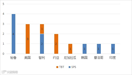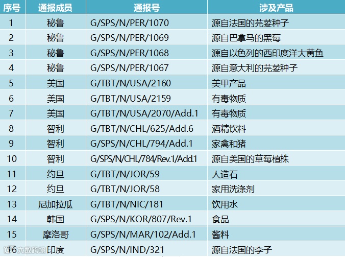 2024年11月20日,共有8个WTO成员通报了16项技术性贸易措施,其中7项为TBT措施,9项为SPS措施。通报情况为:秘鲁4项、美国3项、智利3项、约旦2项、尼加拉瓜1项、韩国1项、摩洛哥1项、印度1项。这些措施涉及源自法国的芫荽种子,美甲产品,有毒物质,酒精饮料,家禽和猪,人造石,家用洗涤剂,饮用水,食品,酱料等。通报详情如图表所示。