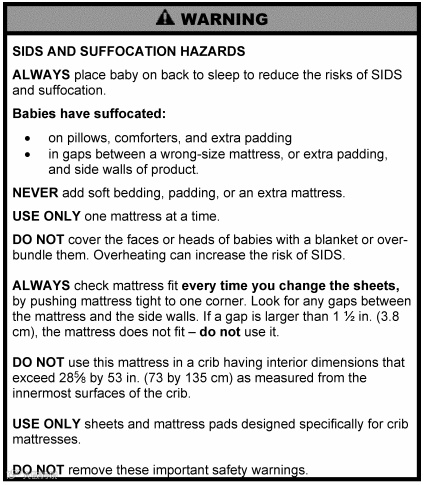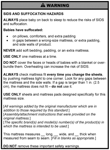 要求:每个婴儿床垫应符合ASTM F2933-21的要求,其变化见16 CFR 1241。这些变化包括:一般要求、试验方法、标记和标签、说明书。