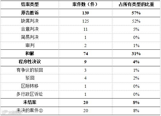商标诉讼方面,案件审理结果以“原告胜诉”结案为主,比重为57%,主要为缺席判决胜诉,仅5%为合意判决,还存在简易判决和审判的情况;以“和解”结案的比重为31%;不存在被告胜诉的情况。版权诉讼方面,案件审理结果以“和解”为主,比重为52%;以“原告胜诉”结案的比重为37%,主要为缺席判决胜诉;仅1%的案件以“被告胜诉”结案。