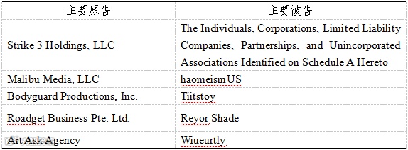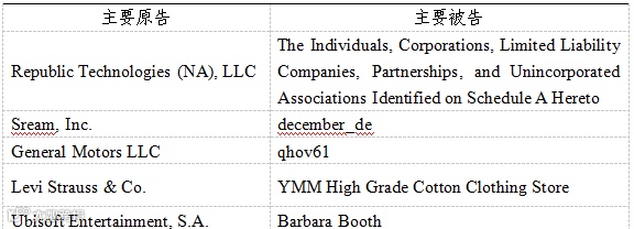 2014—2024年间,Bucklo法官审理的知识产权诉讼案件主要集中在商标、版权领域。其中,商标诉讼案件的原告主要集中在汽车制造公司、设计公司、游戏公司、服装公司等,被告主要集中在外贸、电商平台的个人店铺。版权诉讼案件的原告主要集中在影视娱乐公司、艺术设计公司、消费品公司等,被告主要集中电商企业和个人。值得注意的是,知识产权诉讼案件中有较多被告以附表A(Schedule A)形式出现。
