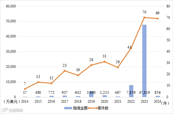 表7 2014—2024年损害赔偿案件及赔偿金额情况