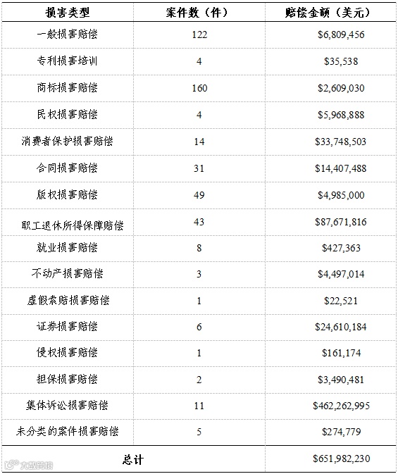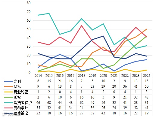Bucklo法官2014—2024年判决的案件中涉及商标赔偿案件数量最多,达160件,赔偿金额共计260.9万美元;涉及版权案件49件,赔偿金额共计498.5万美元;涉及集体诉讼案件的赔偿金额最高,11件集体诉讼判赔案件共计赔偿金额约46226.3万美元。值得注意的是,诉讼判赔案件数量自2014年以来总体呈增加趋势,2023年达峰值共70件,判赔金额也达到顶峰47819万美元,判赔金额年份差别较大。