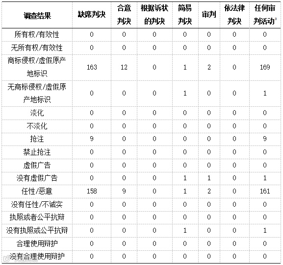 商标调查结果中认定存在商标侵权、虚假原产地标识、抢注、恶意行为的判决以缺席判决为主,少部分集中在合意判决,也有部分简易判决和审判的情况。调查结果中认定不存在商标侵权、虚假原产地标识、没有虚假广告、没有执照或公平抗辩的判决集中于简易判决。版权调查结果中认定存在版权侵权、恶意行为的判决以缺席判决为主,少部分集中在合意判决和审判;仅有1起认定不存在侵权行为的判决为简易判决。