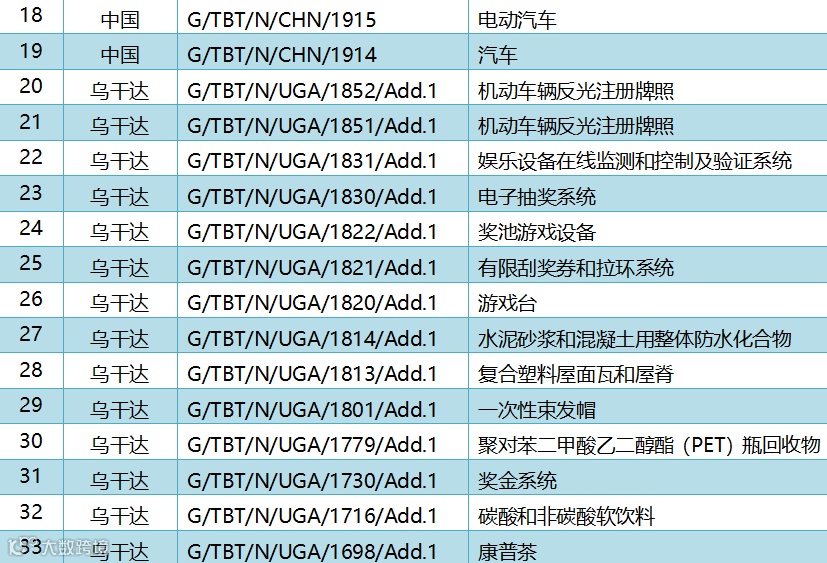 2024年10月17日,共有11个WTO成员通报了50项技术性贸易措施,其中44项为TBT措施,6项为SPS措施。通报情况为:中国19项、乌干达14项、美国8项、欧盟2项、韩国1项、立陶宛1项、智利1项、英国1项、日本1项、俄罗斯1项、澳大利亚1项。这些措施涉及快递包装,三轮车,电动自行车,电动汽车,机动车辆反光注册牌照,一次性束发帽,碳酸和非碳酸软饮料,衣用洗涤剂,氢氟碳化物,无线电设备,饲料和饲料添加剂等。通报详情如表所示。