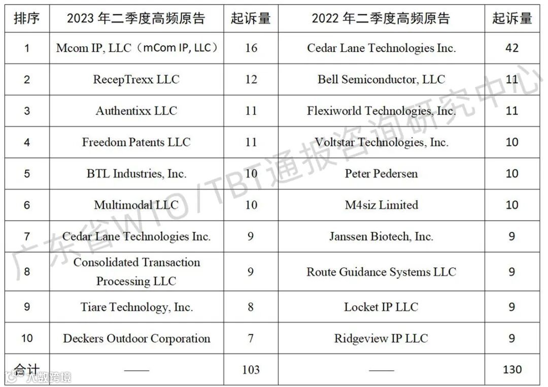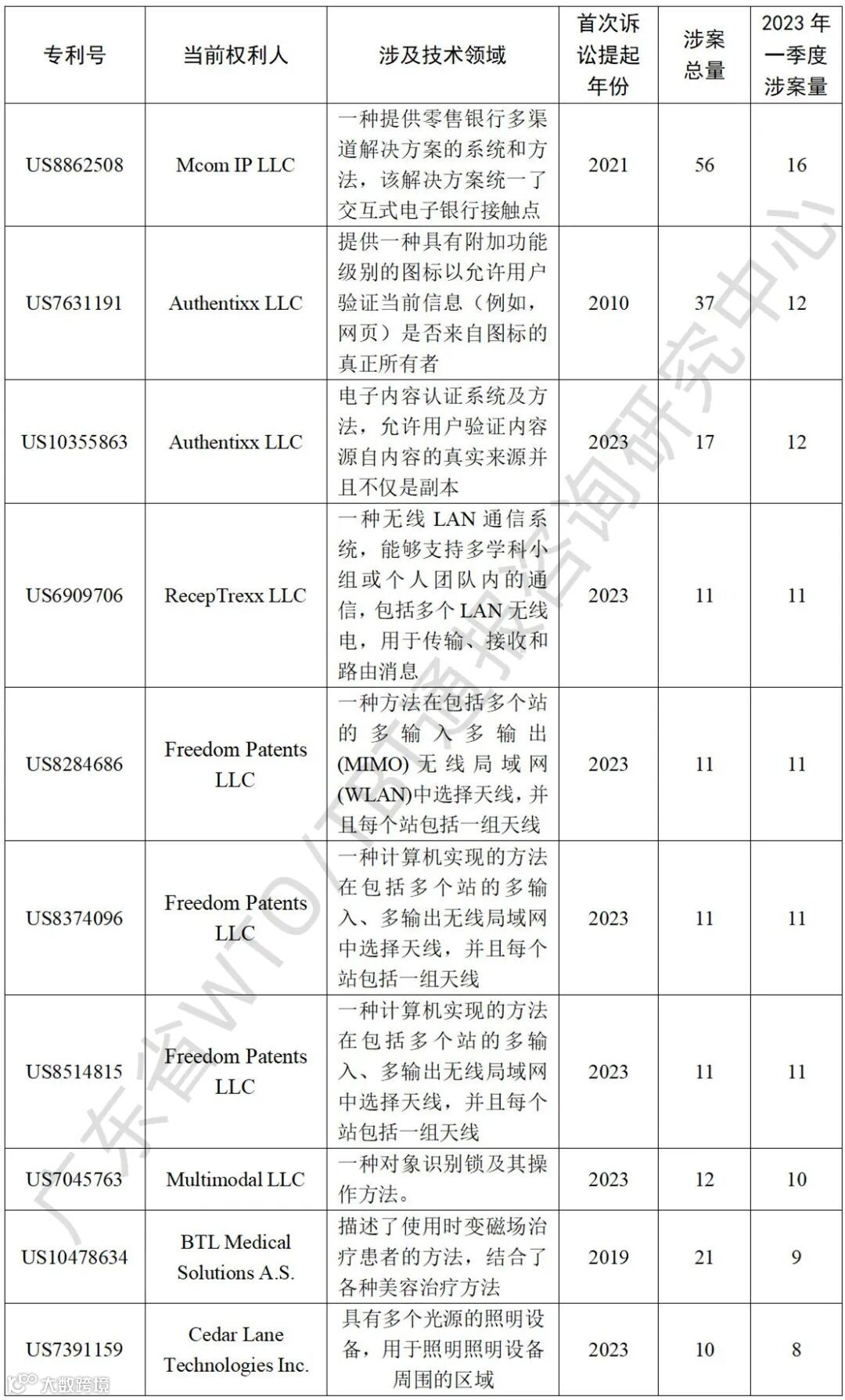 2023年二季度,美国专利诉讼案件的涉案专利主要集中在电子信息、电子商务、通信、医疗美容、制造业等领域,多以专利组合形式提起,且部分专利为临期专利。排名前十的高频专利诉讼量占二季度诉讼量的13.79%,比去年同期减少5.48个百分点,主要受高频原告Cedar Lane与Bell Semiconductor, LLC活跃度大幅降低影响。高频涉案专利主要有:
